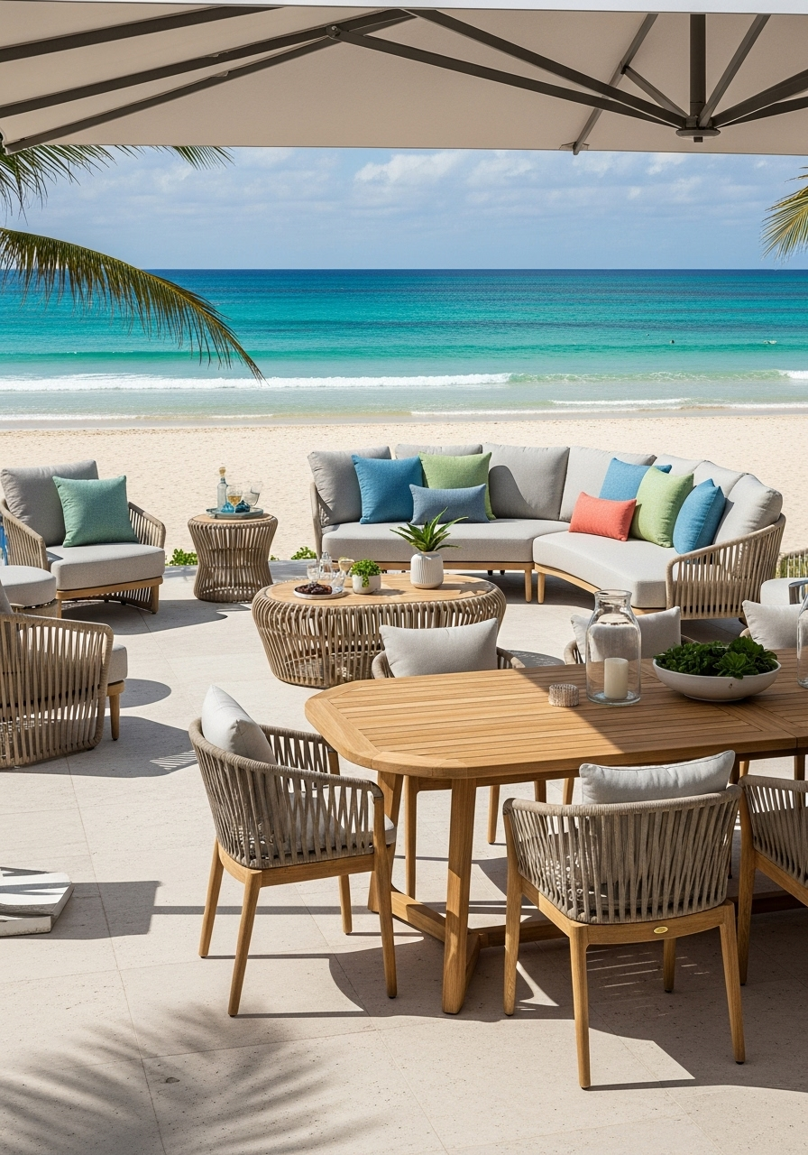 Materiales Clave: La Madera de Teca es la protagonista, combinada con telas Sunbrella® en tonos tierra, taupe o verdes profundos.