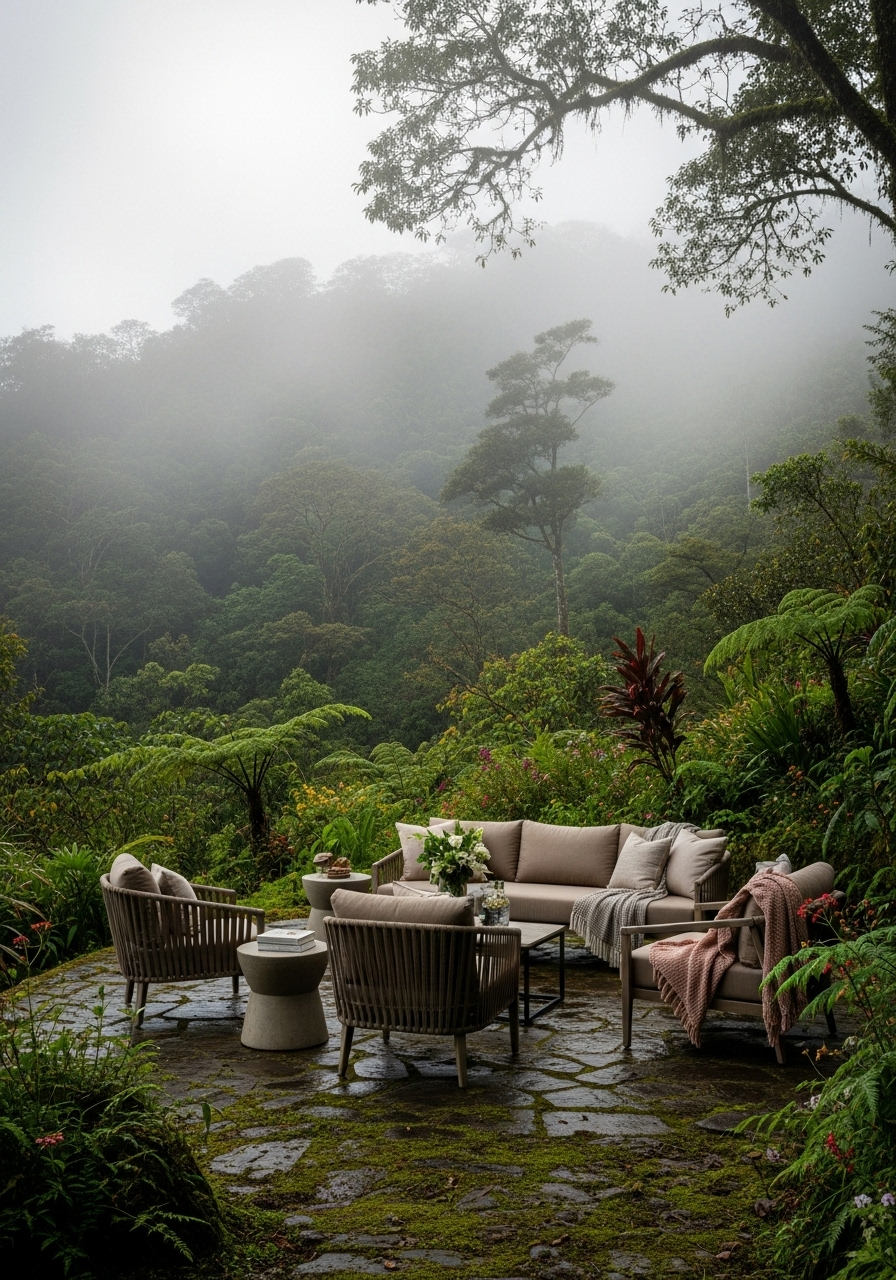 En las alturas, el lujo es calidez, confort y conexión con la naturaleza. El mobiliario debe ser una extensión del paisaje, un refugio acogedor para disfrutar del clima fresco y la tranquilidad. La paleta de colores es terrenal y cálida, y los materiales invitan al tacto.