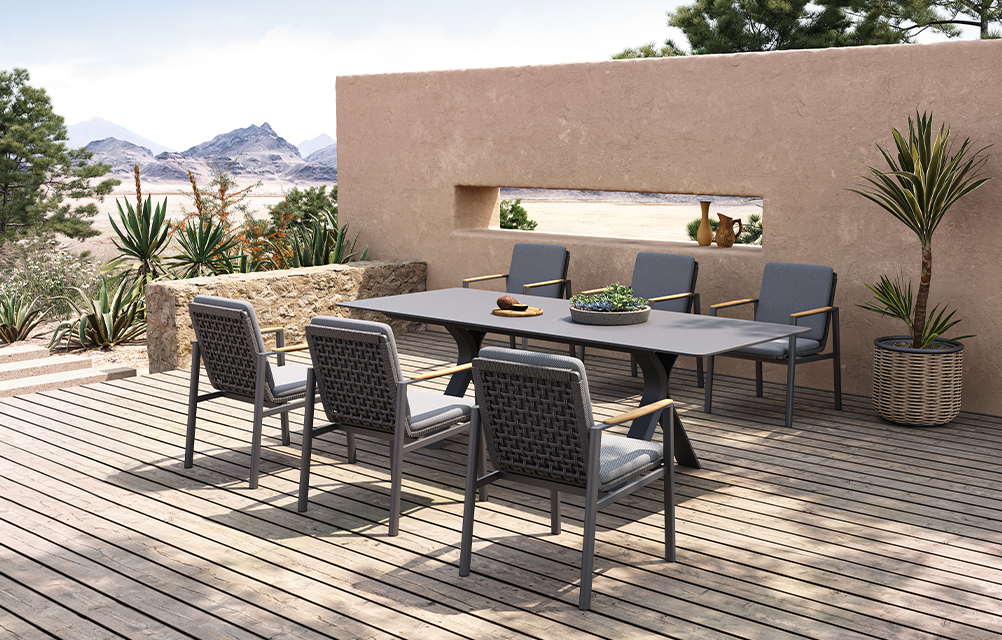 - Sillas de Diseño: Sofisticado trenzado de fibra sintética "Dark Charcoal" y cojines en tela Olefin de alto rendimiento.