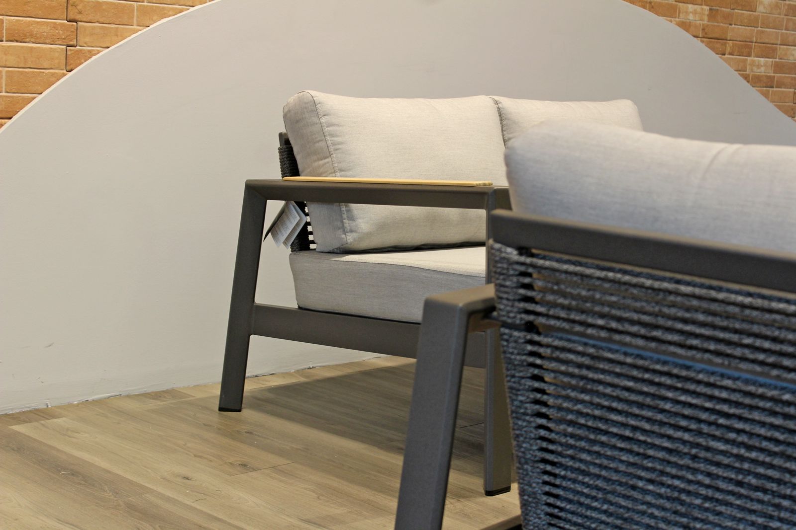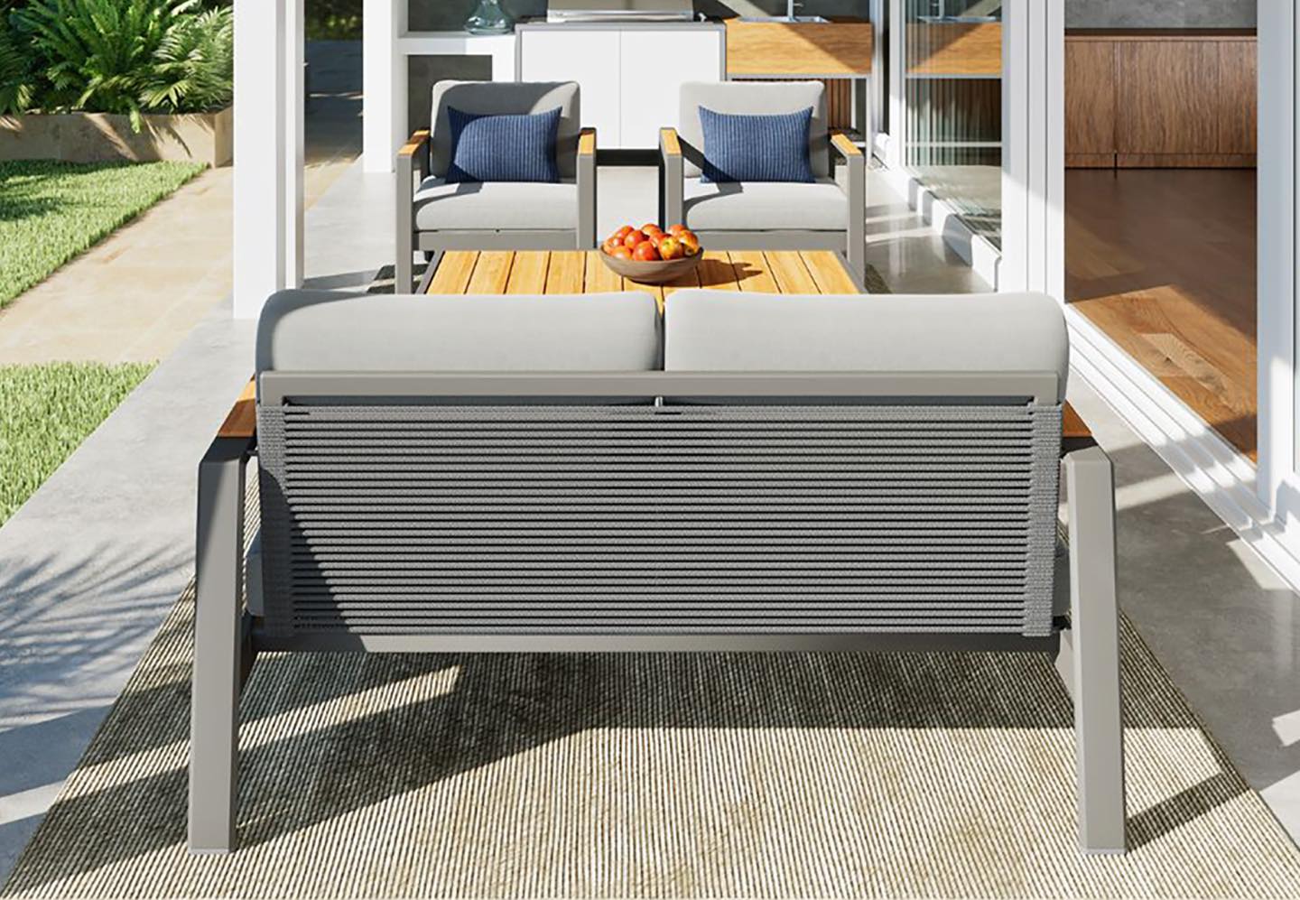 - Diseño de Vanguardia: Una sofisticada paleta de grises se encuentra con la calidez de la Madera de Teca y el exclusivo trenzado de lona.