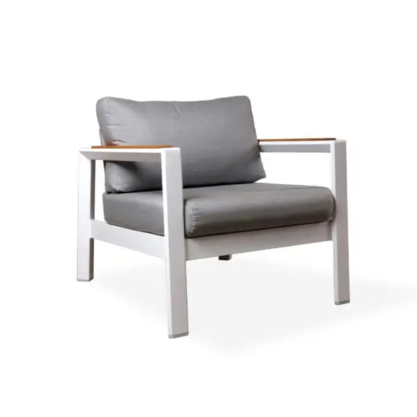 Estructura: Aluminio (pintura electroestática) con acentos de Madera de Teca y trenzado de lona.